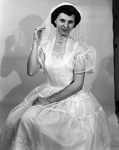 Image shows Mrs. Alvin L. Langford in wedding dress. The bride is shown wearing imported white organdy designed with embroidered border above the hemline. She wore a white hat pleated organza. The reception was held at the home of her parents, Mrs. Betty Lou Langford, Jannette Langford. Mr. and Mrs. Langford will reside at 2504 Bomar. Both are graduates of Polytechnic high school. He attends Texas A&M. Out of town guests were, Mrs. H. S. Atkinson, Miss Laurene Kelly and Mr. and Mrs. E. C. Kelly, Greenville, Mr. and Mrs. Clyde Bennett , Mr. and Mrs. John D. Bennett, Waco, Mrs. J. R. Wheeler, Roanoke and Mr. and Mrs. E. M. Murdock and Wayne Denton. Published in the Fort Worth Star-Telegram morning edition, June 18, 1950.