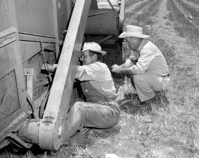 Image shows Jewel Ramage working on one of the Ramage farm's combines. Right is Elmer S. Rothey, Stephenville Soil Conservation Service (SCS) work unit conservationist. Published in the Fort Worth Star-Telegram morning edition, September 3, 1950.
