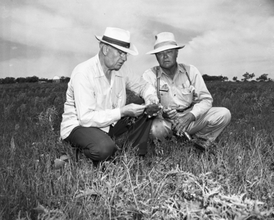 Image shows Mr. Shaw, left and Doyle Cole, right, Abilene Soil Conservation Service (SCS), inspecting root system of Alfalfa plant in Shaw's field. Published in the Fort Worth Star-Telegram , November 5, 1950.
