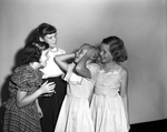 Image shows four children from the 4400 block of Birchman and Calmont are performing a staged play. The four plays were staged for the benefit of the Fort Worth Star-Telegram Milk and Ice Fund. Earning $4.09 for underprivileged children were, left to right, Sharon and Carolyn Tellinger,4405 Birchman, Charlotte Johnson,4412 Calmont and Judy Hart, 4424 Birchman. Published in the Fort Worth Star-Telegram morning edition, June 18, 1950.