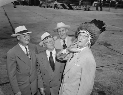 Image shows Jesse G. Prewett wearing a Native American head piece. He gives out a war woop as his band of North Fort Worth Kiwanians return from Inter Club visit to Holdenville, Oklahoma. Beside Prewett is Houston P. Hutchens, left and Bill Jordan. Published in the Fort Worth Star-Telegram morning edition, June 15, 1950.