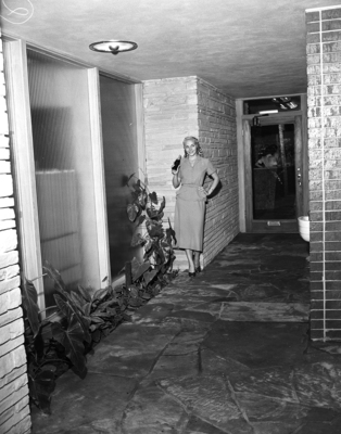 Image shows Miss Cecile Weber, 3616 Modlin, standing in a flagstoned hallway beside a plant bed. She is shown drinking a bottle of soda. Published in the Fort Worth Star-Telegram morning edition, June 25, 1950.