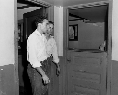 Image shows two Worth Food Store burglars. James Adrian Forsythe, 17, front and Cara Louis Young, 19, both of 3325 Saint Louis, who were arrested after a Worth Food Store burglary with their cowboy boots stuffed with cash, enter city jail. Published in the Fort Worth Star-Telegram evening edition, June 15, 1950.