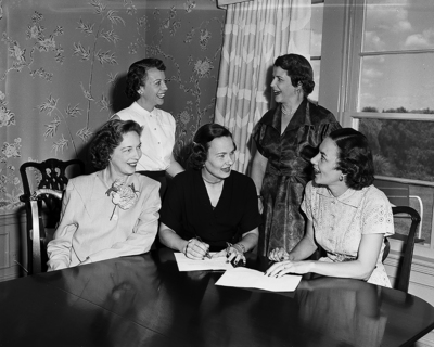 Image shows a group of charter members of the Fort Worth Children's museum women's auxiliary. They are show discussing the interests and enlarge activities of the Children's museum. From left to right are, Mrs. Jack Wilkinson, Mrs. William S. Potts, Mrs. Perry Bass, Mrs. J. E. Hill and Mrs. Kenneth Toal. Published in the Fort Worth Star-Telegram morning edition, June 18, 1950.