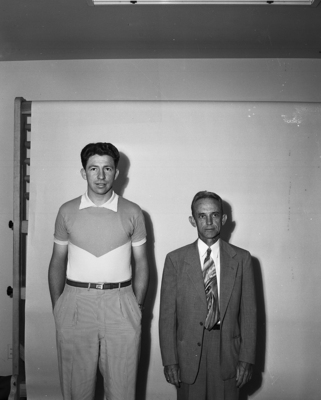 Image shows Bill J. Baker standing next to unidentified man posed. Bill J. Baker has been named minister of music at First Church of Nazarene. He comes to church from Trousdale, Kansas., where he was a basketball, football and track coach. He is a student at Texas Christian University (TCU). Published in the Fort Worth Star-Telegram evening edition, June 16, 1950.