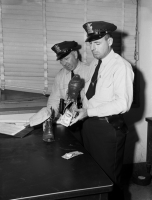 Image shows two policemen going through evidence from theft. D. G. Latham, right is pouring out money from a cowboy boot while his partner, T. E. Hayes, holds another boot containg a money bag. The patrolmen found $ 2,622.89 in the boots worn by two people they arrested seven minutes after Worth Food Store, 604 S. Jennings, was broken into. Published in the Fort Worth Star-Telegram evening edition, June 15, 1950.