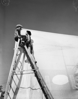 Lois White and John Sammons, two young stage crew helpers, go into the air to erect a stage wall. Published in Fort Worth Star-Telegram morning edition June 18, 1950.