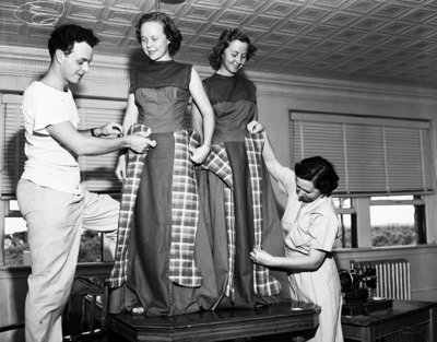 Reily Nail and Mrs. D. C. McCord of the wardrobe department attend a costume fitting for two chorus members, Misses Barbare Daniell, left, and center, and Pamela Godwin. Published in Fort Worth Star-Telegram morning edition June 18, 1950.