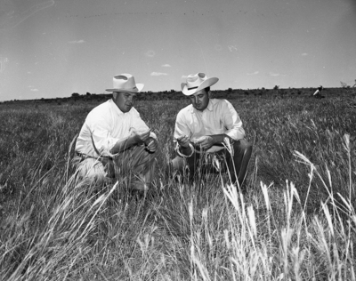 Image shows two Oklahoma ranchers, W. D. Bradley, Waurika, left and James Price, Addington, right, inspecting Allen grass in field. Published in the Fort Worth Star-Telegram , November 5, 1950.
