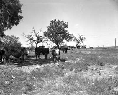 Image shows a shot of Hereford cattle relaxing near water tank on Allen farm. The cattle graze on a nearby 110 acre Madrid clover Johnson pasture. Published in the Fort Worth Star-Telegram , November 5, 1950.