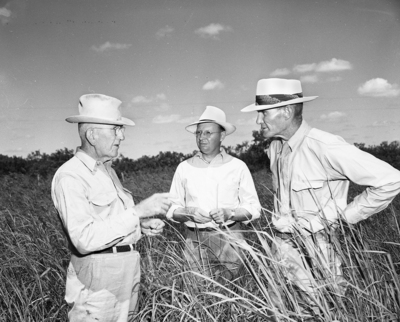 Image shows T. J. Allen, left, Coleman, explaining how his grass test field was planned to J. G. Wilke, center, bank cashier from Trent and Louis Butman, right, Merkel. The three men are shown to be in the middle of the grass field. Published in the Fort Worth Star-Telegram , November 5, 1950.