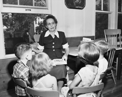 Mrs. C. V. Herren shown talking to unidentified children. Published in Fort Worth Star-Telegram, morning edition June 18, 1950.
