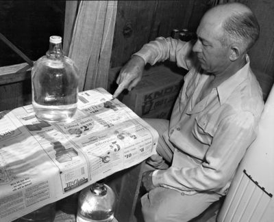 Howard Ferguson, who resides on the Arlington - Kennedale road, shows how a bottle of water became a magnifying glass and caused sun rays to start a fire on a newspaper. Mother Nature came to the rescue and saved the Ferguson house and furniture when wild blew out the blaze. Published in Fort Worth Star-Telegram, evening edition June 17, 1950.