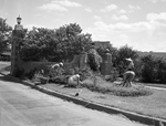 One of the projects of the Monticello Garden Club is the maintenance of the gate at the entrance to their addition. Left to right, Mrs. Roy Brasher, Mrs. Carrol Hinners, Mrs. Fritz Barton, Mrs. Tom B. Petty Junior, and Mrs. William Bonnell taking their turns as a part of Fort Worth's cleanup and beautification campaign. Published in Fort Worth Star-Telegram morning edition June 18, 1950.