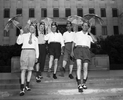 Ready for that deep ankle-deep California "sunshine" with umbrella and rolled up pantaloons are, left to right, George Beaudry, president; J. D. Garner, Marsline Moore, A. A. Mehl and Jack Shytles of the Moslah Temple Drum and Bugle Corps which left for the Shrine convention in Los Angeles. Three hundred Shriners were aboard the special train. Published in Fort Worth Star-Telegram morning edition, June 18, 1950.