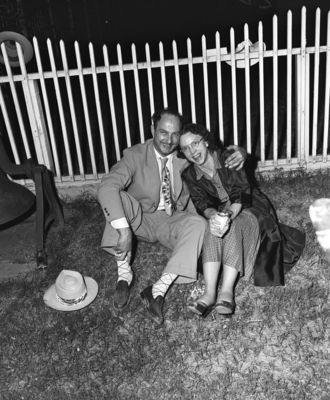 Mr. and Mrs. J. H. Compton sitting in front of a picket fence, smiling. The couple is from La Junta, Colorado. This photograph was taken during a meeting of the Texas Press Association.