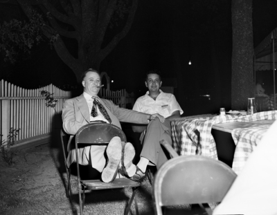 William P. Davis, left, smoking a cigar with his hand on Weldon Nowlin's knee. The men are sitting next to a picnic table, outdoors. There is a picket fence in the background. This photograph was taken during a meeting of the Texas Press Association.