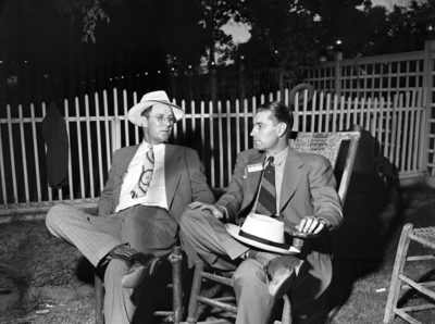 Jack Scott, left, and Jetty V. Clare seated in front of a fence at a gathering for the Texas Press Association.