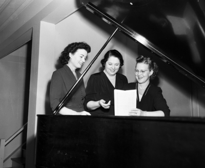 Mmes. John Brigham, soprano; Charles Cope, contralto; and George Carsrud, second soprano, left to right, will be presented with the Harmony Club chorus at the 39th annual club concert at 3:30 p.m. at Central Methodist Church. Mrs. Gerald Wren, president, will be hostess; John W. Brigham, director, and Mrs. Henry E. Wright, accompanist.