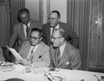 Members of the Fort Worth - Dallas chapter, American Association of Oilwell Drilling Contractors Association, received tips on cost accounting at their bimonthly meeting at the Blackstone Hotel. Lyle Sproles, left, seated, Fort Worth, was the speaker. F. W. Brigance, right, seated, Rowan Drilling Company, is Fort Worth chairman. Standing, left to right, are Macon Gardner, Gardner Brothers Drilling Company and D. E. Kirvin, M. J. Delaney Drilling Company, both of Dallas. Published in Fort Worth Star-Telegram, morning edition June 20, 1950.