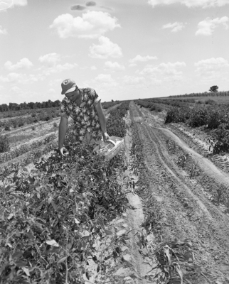 Image shows A. Y. McPherson, famer- railroad man, picking tomatoes in his five acre field near Cleburne. Published in the Fort Worth Star-Telegram morning edition, July 2, 1950.