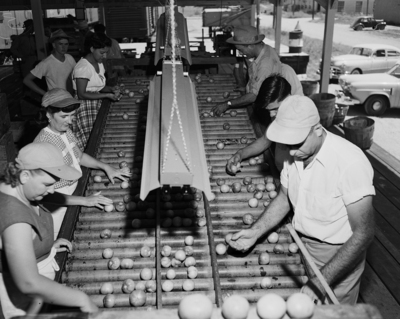 Image shows Cleburne Packing plant workers sorting tomatoes on packing line. Published in the Fort Worth Star-Telegram morning edition, July 2, 1950.
