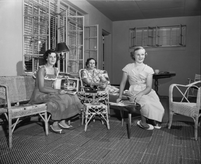 Mrs. Archie J. Old Jr., center, listens as her niece, Becky Fuqua of Texarkana, left, and daughter, Adeline, right, make plans for a summer outing. Becky and Adeline, whose birthdays are only two weeks apart, spend much of each summer together. Published in Fort Worth Star-Telegram, morning edition June 28, 1950.