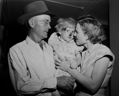 Donna Marie Smith, 3-year-old victim of a dog attack, is comforted by her mother, Mrs. N. W. Smith, at Pennsylvania Avenue Hospital. The child was bitten at farm home near Paducah. Published in Fort Worth Star-Telegram, morning edition June 21, 1950.