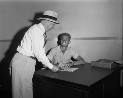 Doug Higgins, right, fills in personal history sheet as explained by Recreation Department Super intendent R. D. Evans. Higgins was named professional at Z. Boaz golf course. Published in Fort Worth Star-Telegram, morning edition June 21, 1950.