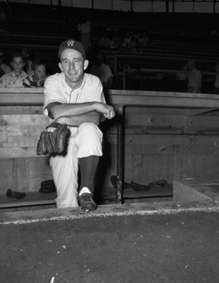 Image shows Ed (Red) Brown, Fort Worth Cats, utility player. He is show posed with catchers mitt in hand in dug out. He has been sign as a free agent by the Fort Worth baseball club. Published in the Fort Worth Star-Telegram evening edition, June 21, 1950.