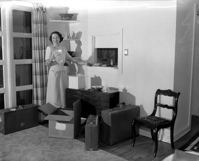 Mrs. Marcia Fender, wife of Mr. James Ernest Fender Jr., the former Miss Marcia Newbill of Oklahoma City, unpacks and begins to settle wedding gifts in the young Fenders' home, 500 Westview. Their wedding trip was to New York and Bermuda. Published in Fort Worth Star-Telegram morning edition, June 25, 1950.