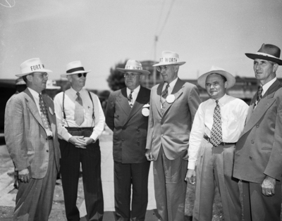 When the Fort Worth businessmen's tour of West Texas reached Lamesa, this group chatted about business conditions. Left to right, John Welsh, Worth hotel; Mayor J. W. Bryant of Lamesa; B. M. Davenport, Traders Oil Mill company; Frank Hall, Automotive-Industrial Supply Company; J. R. Earnest, chairman of Lamesa Chamber of Commerce retailers committee; and Ernest L. Moody, president of Lamesa Chamber of commerce. Published in Fort Worth Star-Telegram morning edition June 22, 1950.