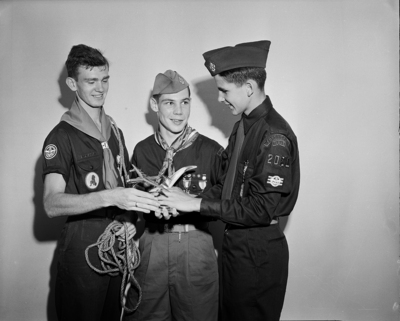Here are the leaders of the three Longhorn Council troops bound for Valley Forge for the Boy Scout National Jamboree. Tom Gallagher, left, son of Mrs. G. L. Gallagher of 1024 Marion, post guide, and Joe Scantlin, center, son of Mr. and Mrs. C. H. Scantlin of 1300 E. Magnolia, and Charles McCollom, senior patrol leader, son of Dr. and Mrs. C. H. McCollom of 3137 Stadium Dr., holds a model of a B-36. Published in Fort Worth Star-Telegram, evening edition June 22, 1950.
