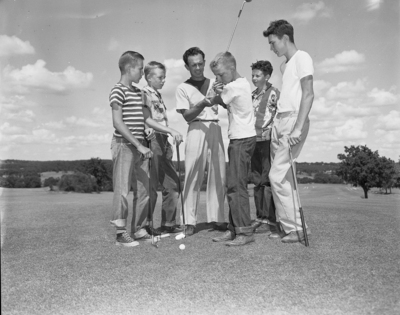 Professional Dennis Dellis of Meadowbrook and five boys he instructed in the city-wide mini golf course summer program of free lessons for youngsters. Left to right, Nolan Reed, Don Ivey, Dellis, George Krown, Joe Daggett, and Jerry Gilmartin. Dellis is helping George with his swing while the rest look on. Published in Fort Worth Star-Telegram evening edition, June 21, 1950.