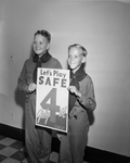 Frankie Schnell, left, of 2505 Goldenrod, and Sam Miller, 2335 Goldenrod, display one of the July 4th safety posters they and other Scout members of Troop 88 will distribute to downtown stores. Published in Fort Worth Star-Telegram morning edition, June 22, 1950. Two boys smiling holding a sign.