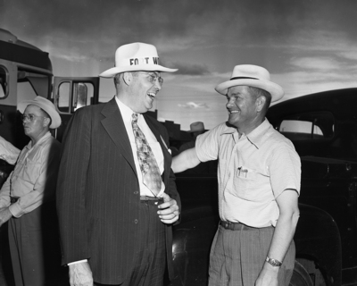 J. Allen Rhodes of the Continental National Bank of Fort Worth, left, and John Reasonover, manager of the Southwestern Public Service Company at Denver City were having a good time when this picture was taken as Fort Worth good-will trippers stopped at Denver City. Published in Fort Worth Star-Telegram morning edition June 23, 1950.
