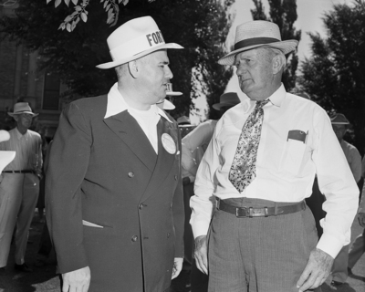 Stewart Hellman, Tarrant County district attorney, left, and George W. Neill, county attorney of Terry County, had common interests when they met at Brownfield as Fort Worth business men visited the city. Published in Fort Worth Star-Telegram morning edition June 23, 1950.