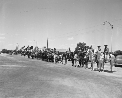 This picture of the blue-shirted Gaines county sheriff's Posse was taken when Fort Worth business men visited Seminole. The posse, headed by Bob McReynolds, Gaines County sheriff, appeared at the Southwestern Exposition and Fat Stock Show in Fort Worth last January. Published in Fort Worth Star-Telegram morning edition June 23, 1950.