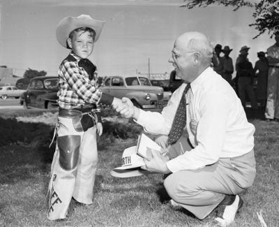 Randall Dewayne Coker, 6, son of Mr. and Mrs. J. R. Coker, shook hands with C. L. Mansfield of the Commercial Standard Insurance Company of Fort Worth when Fort Worth Goodwill Trippers visited Seminole. Published in Fort Worth Star-Telegram morning edition June 23, 1950.