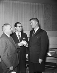 Dr. Paul M. Stevens, is presented gifts in honor of his service as director of the Southern Baptist Radio and TV Commission. Roy Bacus, makes the presentation, and Reverend James G. Harris looks on.