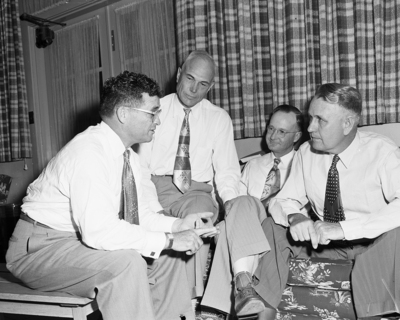 Visiting Fort Worth business men were briefed on development at Hobbs, New Mexico, during a visit there. Left to right are L. W. Jernigan, president of the Hobbs Chamber of Commerce; G. D. Wiley of Swift & Company; J. T. Sayers, acting mayor of Hobbs, and D. J. Stubblefield of the Acme Brick Company. Published in Fort Worth Star-Telegram morning edition June 23, 1950.