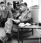 The gaily decorated Christmas tree stood in one corner of the fashionably furnished room. A group of people sat around the room, laughing, talking, sipping coffee and eating Christmas cake. All the outward signs of the holiday season were present yet somehow there was a sense of foreboding that overshadowed even Christmas. Perhaps it was the loaded revolver that dangled in the shoulder holster of each man. Or the knife clipped to the dull gray flying suits. Or the drabness of the portion of Carswell Air Force Base that could be seen through the windows of the alert room, where the men who would man the Strategic Air Command bombers waited, even on Christmas Eve. Or most of all absence of laughing children, of loved ones, of a big turkey on the table. Image of Major Robert A. Williams, who is not at home this Christmas.