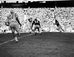 Completion- Air Force End Charles Rodgers hauls in a a pass from Rich Mayo for an eight-yard gain in first quarter of Cotton Bowl game. Texas Christian University (TCU)'s Dale Walker (52) made the tackle. Play carried to the Falcon 28-yard line.