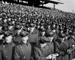 Cadet Cheers - Uniformed cadet wing of Air Force Academy cheers the undefeated Air Force Academy (AFA) team during Cotton Bowl action. Cadets stood during entire game after they participated in colorful pre-game grand entry. The cadets were a highly vocal part of the huge Cotton Bowl crowd.