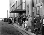 Caught Here By Derailment - This group of westbound T&P passengers were awaiting chartered buses at the T&P Depot Friday to ride o Santo where they will ride train equipment which will back up to Baird. Their journey on the Texas Eagle was halted when a freight derailed at Brazos, east of Santo.