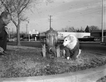 A leaking fire hydrant coupled with subfreezing temperatures left this mass of icicles in Arlington Heights. It was something for Laddie to think about, and he was dressed for the ocassion in a warm sweater.