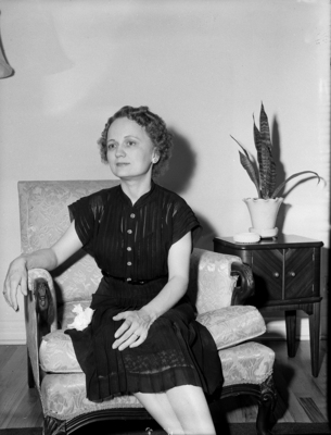 Mrs. Catherine Edwards (Mrs. Code E. Edwards). She was elected president of the Ex-Students Association of Texas State College for Women. Mrs. Edwards is shown sitting down wearing a button up dress. With a smirk on her face. Published in Fort Worth Star-Telegram evening edition, June 26, 1950.