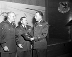 Plaque For Departing Officer - Colonel John A. Roberts, right accepts a plaque from Brig. Gen. Nils O. Ohman, left, and Colonel James Y. Parker. The plaque was represented by the officers and men of the 7th Bomb Wing.
