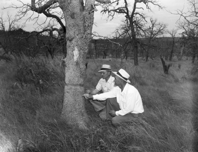Soil Conservation Service conservationist R.A. Box, left , and Homer B. Sewell, right, examines a "ringed" trunk of a tree on Sewell's pasture land.