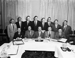 Baseball Visitors - Officials of the American Association gather for their first meeting in Texas. Left to right, seated, are Gene Lawing of the Chicago Cubs and the Fort Worth Cats; Bob Howsam, president of the Denver Club; Ed Doherty, league president; J. W. Bateson, Dallas owner, and H. B. (Spec) Richardson, Houston general manager. Standing, same order, are Ray Johnson, Indianapolis general manager; Harrison Wickel, Fort Worth general manager; George Brophy, Minneapolis general manager; Bill Bergesch, Omaha general manager; Hillman Lyons, Charleston general manager; Lynn Stone, Louisville general manager; Stan McIlvaine, Dallas general manager, and Jim Burris, league secretary. The officials will convene in Fort Worth Sunday.